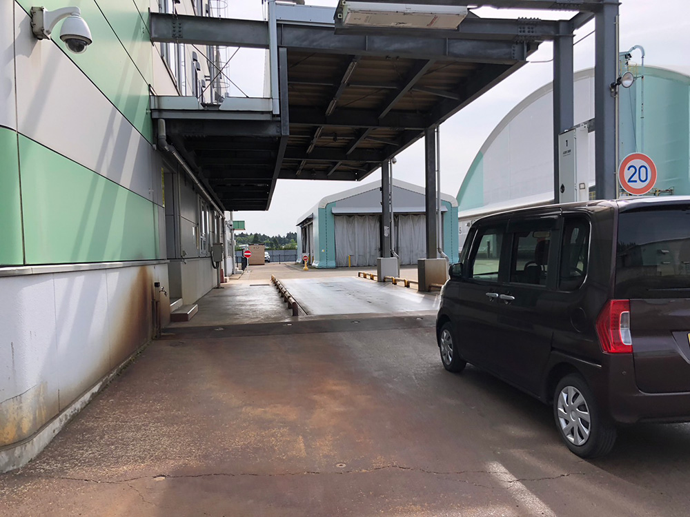 受付と計量を行います。計量場所に車を停車し、一度車から降りて、受付窓口へお越しください。